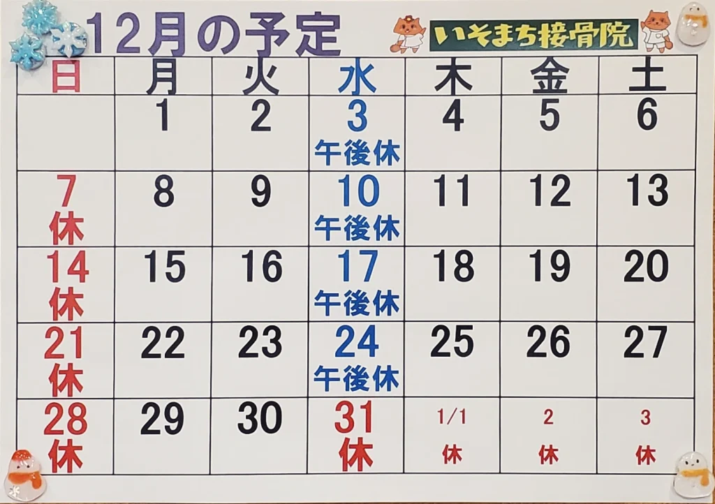 年内は30日までいつも通りの時間で診療しております、来年は1月5日の月曜日からになります。